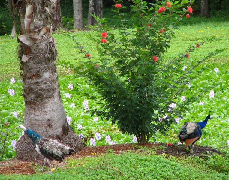 Here they are by one of the flowering bushes (Calliandra haematocephala) that we have by the pond. The flowers you see in the background are the water hyacinth in bloom.