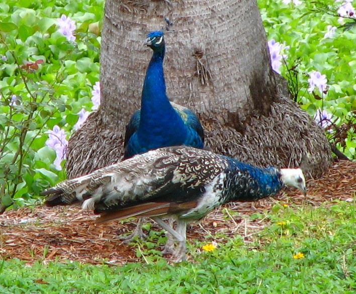 Our peacocks have been kept in an aviary, so that they can bond with each other and get familiar with their surroundings, but the time has arrived for them to have an opportunity to roam the farm. James let them out of their aviary, so that they could explore. I got my camera and took some photos. Here they are heading over toward the statue of St. Francis. It is amazing how animals seem to be attracted to this statue. In the first photo, Burt, the three year old India Blue Peacock is on the left and Ernie, the six month old Black-Shouldered Peacock, is on the right. You can see how Ernie has just begun to get some color in his feathers.