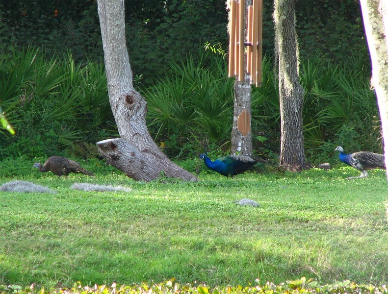 I was outside this afternoon, doing a little project for our guineas when James called to me to get my camera. He had spotted a turkey coming out of the woods toward our peacocks. We had heard that sometimes peacocks and wild turkeys will forage together. By the time I got my camera, Burt and Ernie were heading toward the turkey.