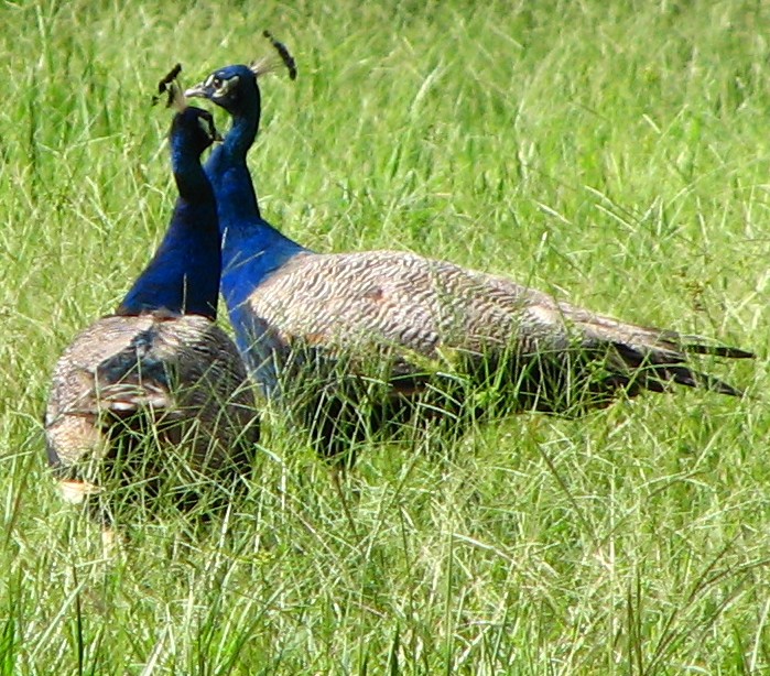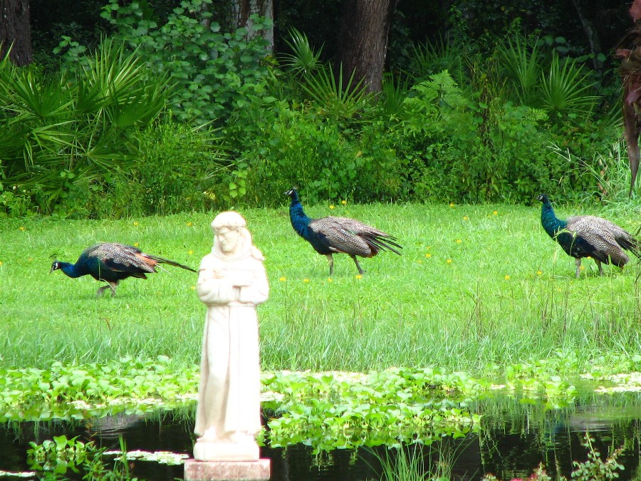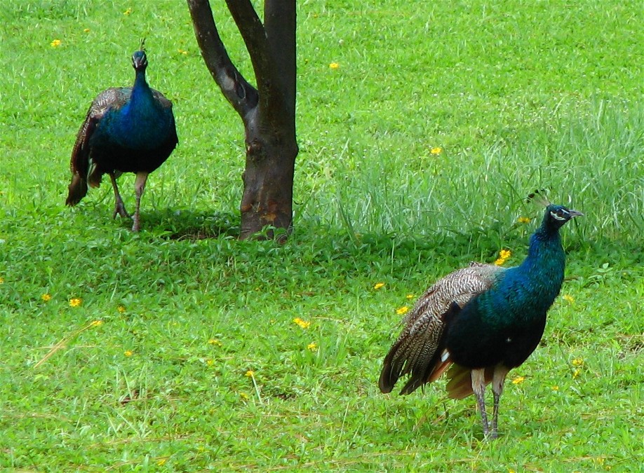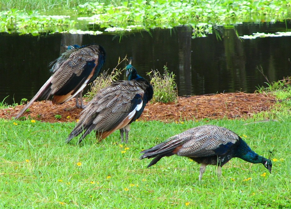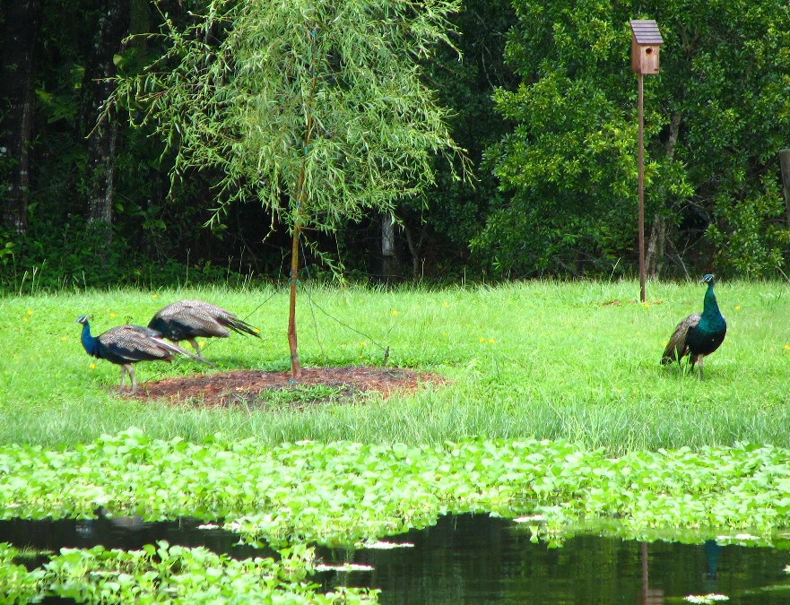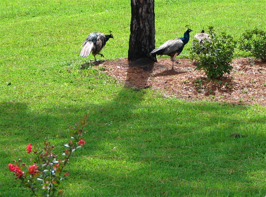 This afternoon, James looked out the window and there were three male peacocks strutting around our pond. We had heard peacocks in the distance before, but did not know where they were and we had never seen them before. They must have been hearing Bert calling out and they came around to investigate the new peacock in the neighborhood. Of course, I grabbed my camera and snapped a few shots.